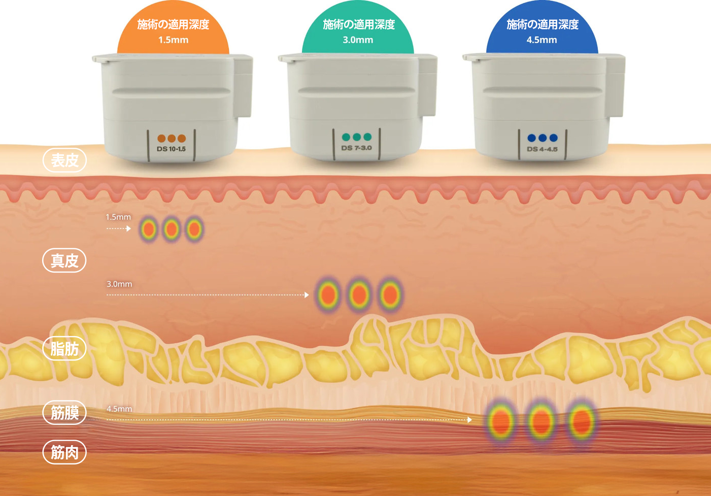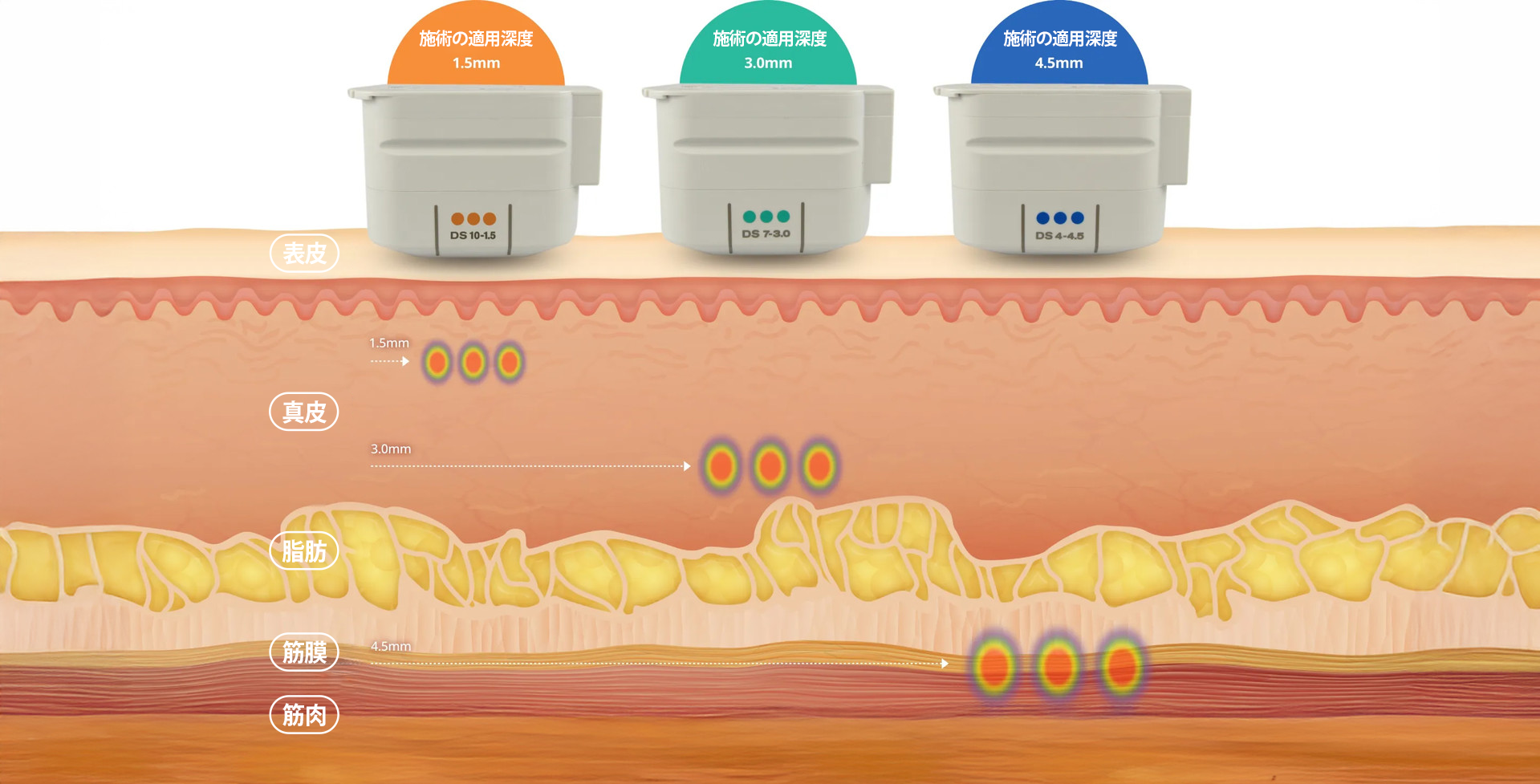 皮膚の深さを正確にターゲットし、 目的の部位に均一なエネルギーを届けます。